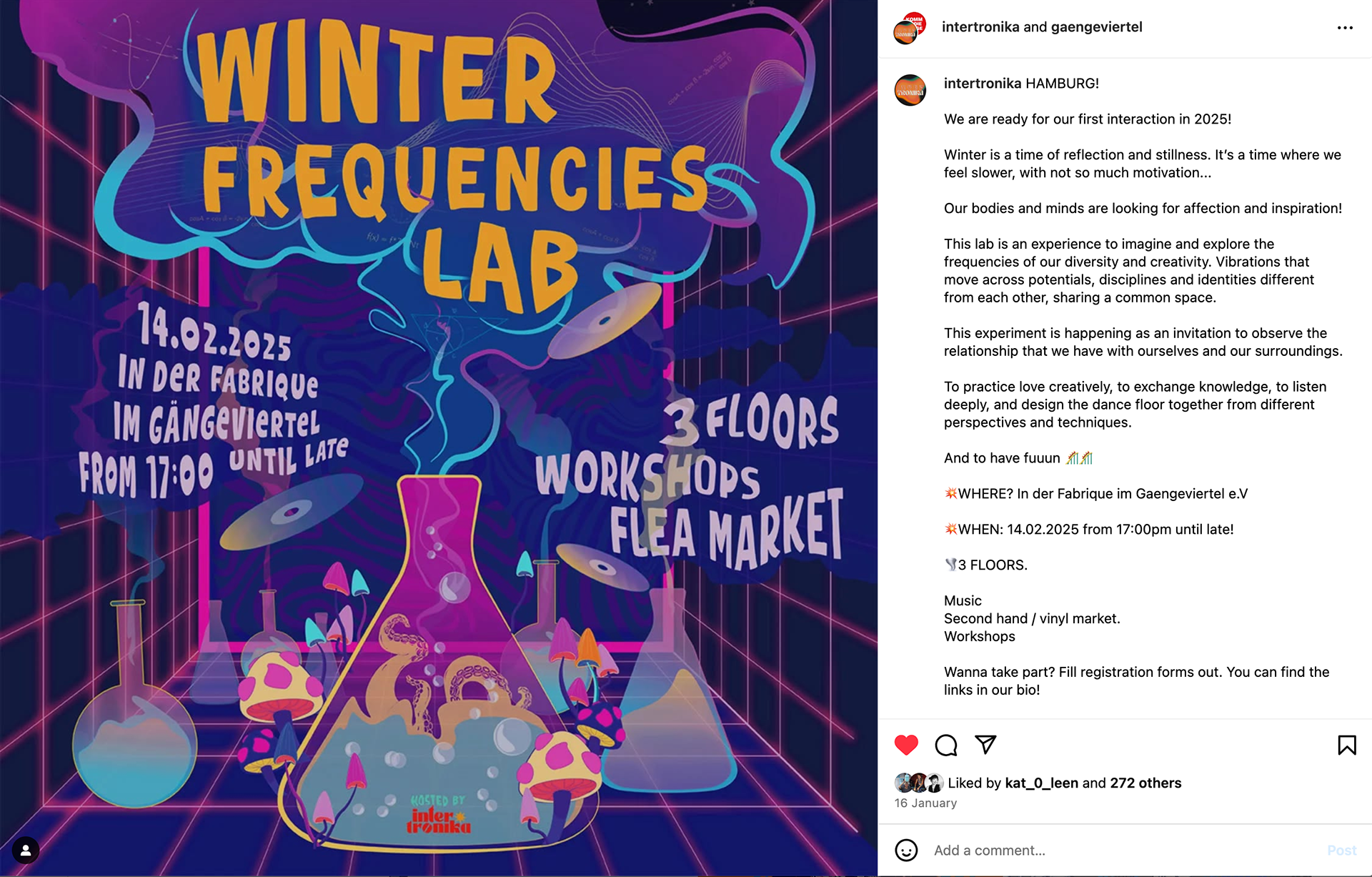 In collaboration with Intertronika, a music collective in Hamburg, I designed an illustration for their event in February 2025. The theme revolved around a laboratory infused with music frequencies. The event featured not only music on the dance floors but also workshops and a flea market. Focused on acid, jazz, soul, and house music, the collective inspired me to blend these genres with their laboratory theme, adding a touch of misty and psychedelic elements.I provided not only the printed event poster but also social media content, including reels and templates for each feed post, detailing their workshop programs.