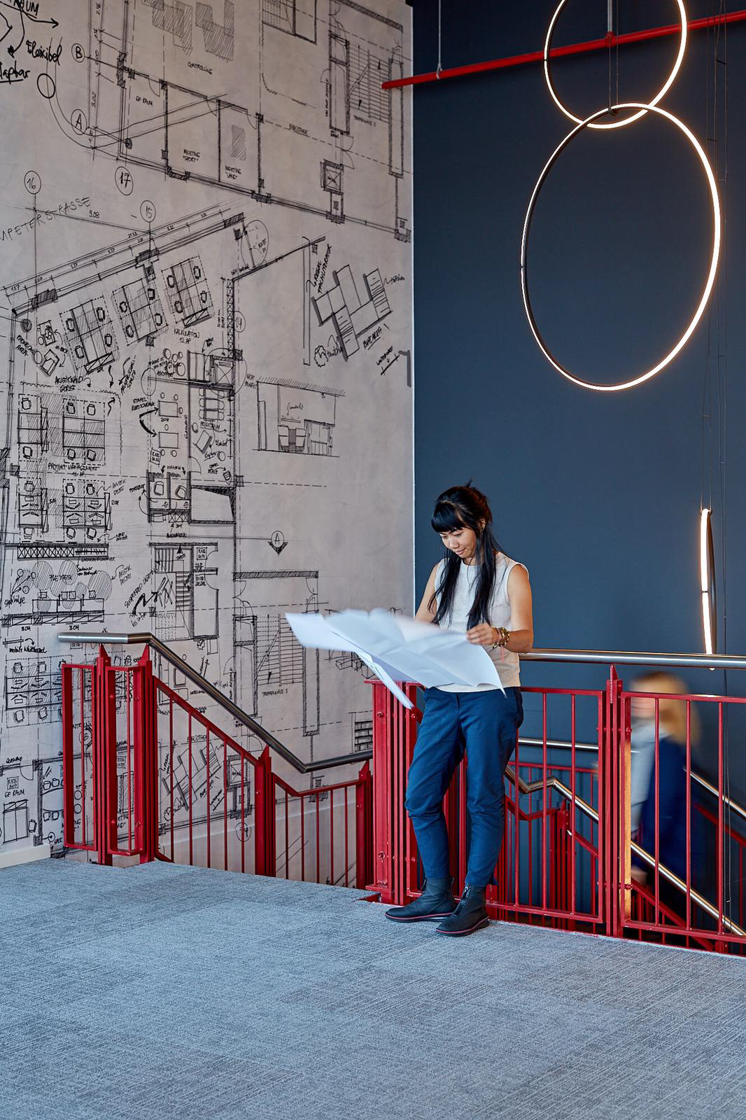 Applied on the wall of 9 meters height and 6,5 meter width connects the two floors and made itself a highlight of the entire office space